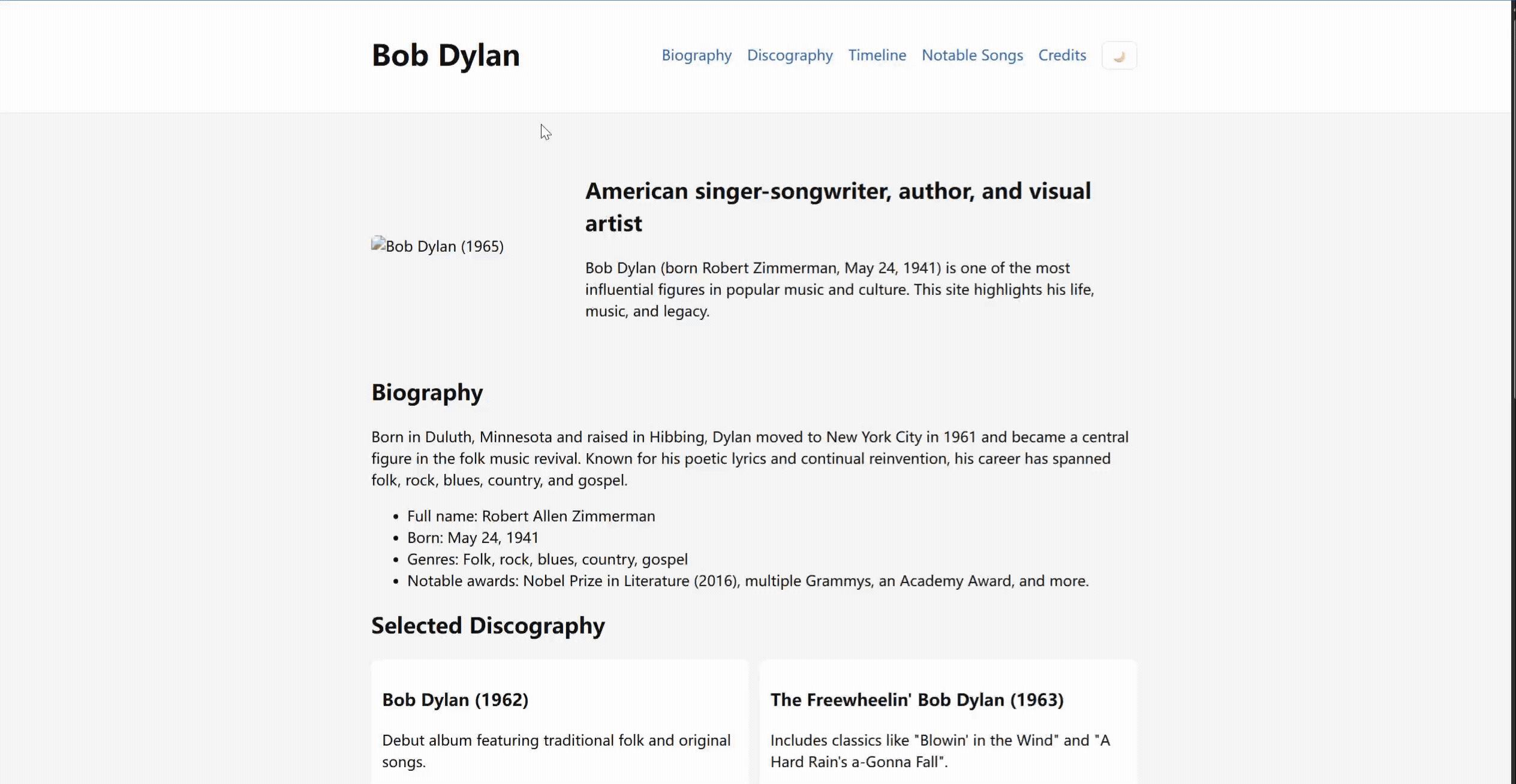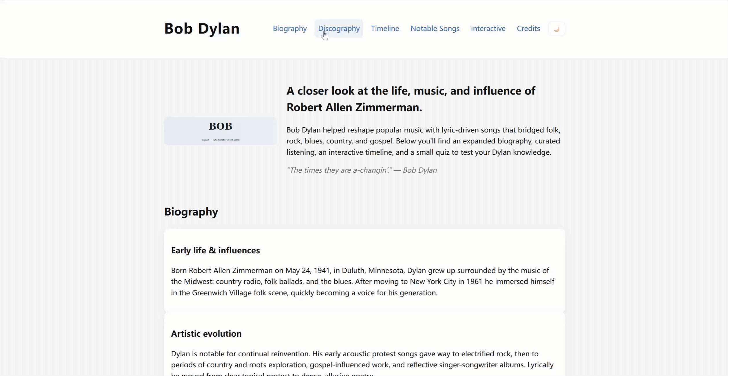 site/index.html - Full HTML with biography, discography, timeline sectionssite/css/styles.css - Professional styling with typography and layoutsite/js/script.js - Basic interactivity and animationssite/assets/ - Gallery placeholder structure.massgen/sessions/session_20251001_180951/turn_1/Turn 1 result: Initial Bob Dylan fan site with biography, discography, timeline, and gallery placeholder sections